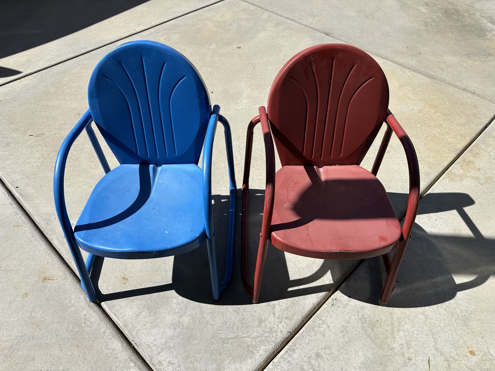 | Product Features | Child’s Youth Toddler Metal Lawn Chair Set Pair Red & Blue Tulip DesignPrice is for both See photos for condition and measurements These are more modern, about 10-15 years old They were repaintedPick up in Rancho Cucamonga I meet here 7170 Day creek blvd cvsNo holds cash only | ||